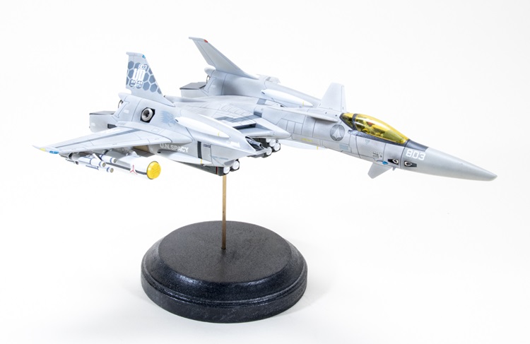 The VF-4 Lightning III operated mainly in space due to minor performance issues in the atmosphere. Of course, this is all in the Macross universe, and Neil built a Wave 1/72 scale kit of the transforming mech in flight mode and outfitted it with a Hasegawa VF-1 weapon set. He primed the Lightning with Mr. Surfacer and post-shaded directly on the primer with Tamiya acrylic paints without first spraying a base coat.