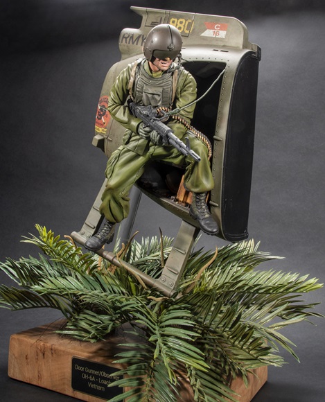 Robert built this War Paint Studio 1/6 scale Vietnam OH-58 door gunner and added scratchbuilt safety harness straps, a comm cord, M-60 bungee, and the inside of the door. He painted and weathered with various acrylics and artist oils and added decals he found online. For the scenery, Robert used heavy-duty acrylic rod and artificial plants from an art store trimmed to size and arranged around the rod.