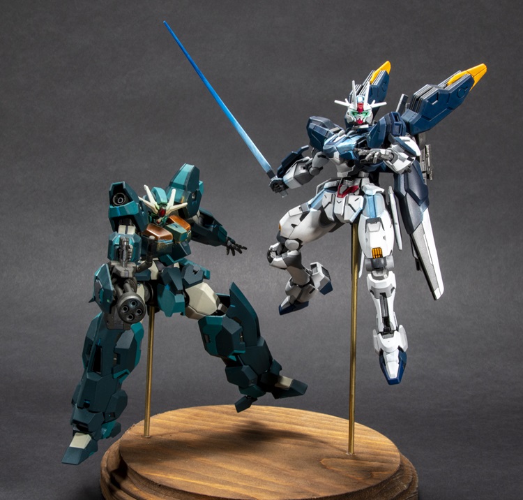 For his vignette called Witches, Josh built two Gundam: The Witch from Mercury Bandai 1/144 scale kits. He built the models box stock, primed, and painted them with Monument Hobbies and Pro Acryl acrylics, adding highlights for the glowing effect on the Gundam torsos. Josh made the base from stained wood.