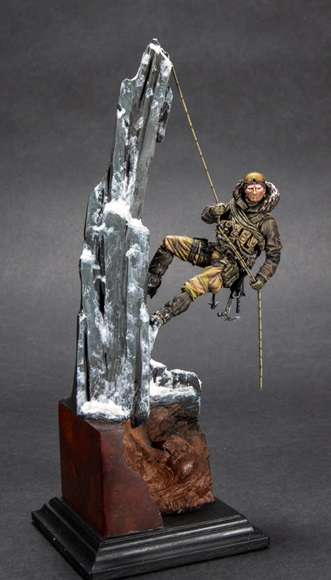David’s U.S. Army Delta Force figure originated as a 75mm figure from Knight Models. He modeled a treacherous, icy outcropping and gave the whole scene an uncanny, lifelike appearance with acrylic paints.