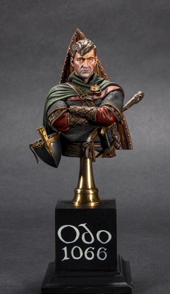 Glenn said that Bishop Odo was William the Conqueror’s half-brother, and he is depicted on the Bayeux tapestry brandishing a club because the church forbade clergy from going into battle with a sword. So, he painted the FeR Miniatures 1/12 scale William the Conqueror Hastings, 1066, as Bishop Odo of Bayeux. Glenn primed with black and white to establish shading and then painted with AK Interactive and Vallejo acrylics. He blended in highlights and shadows with artist oils and highlighted the chainmail with graphite dust and a blending tool.