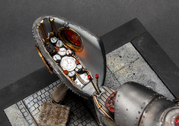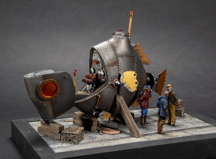 Jeff placed 54mm figures on a base with his Industria Mechanika 1/35 scale FichtenFoo’s Fantastical Fish-shaped Submersible model to show its scale. He painted it all with various Mig and Vallejo paints, including metallic colors to give the submarine a steampunk look. Jeff weathered the underwater machine with rust by AK Interactive.