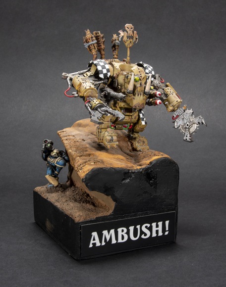 David says that the Citadel 1/28 scale Warhammer 40K Ork Deff Dread was fun to paint. He scratchbuilt the base with EPS foam, added barbed wire, primed, painted, and weathered with rust effects for a diorama he calls Ambush.