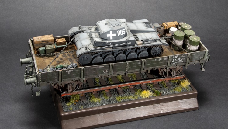 Mike added Aber photo-etched metal fenders and accessories to his Tamiya 1/35 scale Panzerkampfwagen II on a Trumpeter German railway gondola. He modified the tracks to fit the railway car and painted it Panzer gray, lightened for shading. The dirt is AK Interactive and Mig pigments.