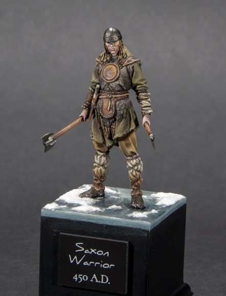Scott brushed-painted his Latorre Models 54mm Hero Saxon Warrior – 5th Century model and airbrushed multiple layers of clear acrylic over the painted base for an icy effect on the lake. Artist-oil washes provided shading, and the cracked ice effect was achieved with many coats of acrylic paint brushed on that naturally fractured.