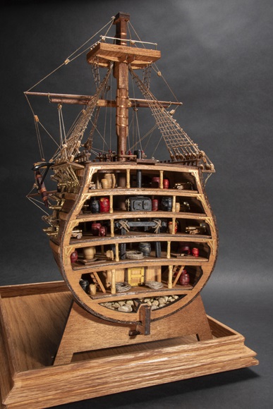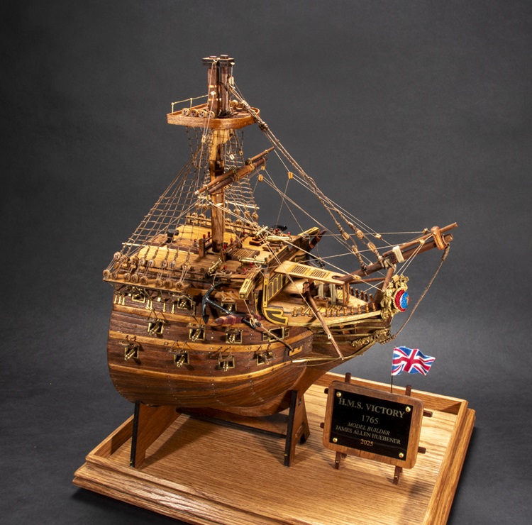 James replaced the hull planking and wales on his Panart 1/78 scale HMS Victory bow cross section ship model kit for better contrast. He built the gun port lids with pull ropes and added ratlines and upper deadeyes. James stained the entire model and placed it on a base of stained oak trim and plywood.