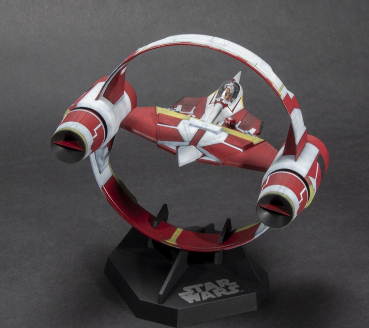 Steve went about his Fine Molds 1/72 scale Jedi starfighter with hyperdrive ring in an interesting way, using the kit decals as masks to airbrush on the details. He painted with MRP paints and weathered with Tamiya washes and pastels.