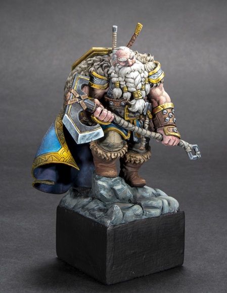 Derek painted an 80mm dwarf warrior sculpted by Rishikesh Nandlaskar. He primed with black primer, added zenithal highlights, and layers of Kimera and AK Interactive 3Gen acrylics and glazing. Derek made the base from Milliput.