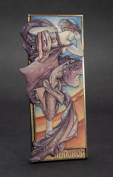Noel based her original sculpt on an Art Nouveau painting by Alphonse Mucha called The Evening Star. She attached brass trim to a picture frame backing and painted the sculpt with acrylics in a different color and lighting scheme than the original painting.