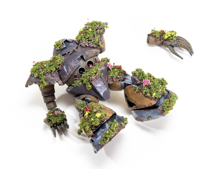 This MSM-3 Gogg has seen the end of its fighting days. Weylin built a Bandai 1/144 scale kit, severing one appendage and finishing it to show a long forgotten mech. He primed the model black, dry-brushed silver, and stippled colors and rust effects across its surface before layering in pastels and washes. For the added touch, Weylin decorated the Gogg with moss and miniature flowers to show it had become part of the countryside where it lies.