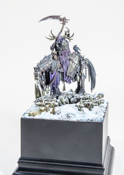 The Harbinger of Decay has never looked so good! Michael assembled the Games Workshop 28mm horse and rider from the package and made a base for it from air-dry clay, wooden sticks, and styrene parts. Reaper and Vallejo acrylic paints provided plenty of color for the undead prophet. Michael pre-shaded, established initial colors with glazes, and then picked out additional highlights and shadows. Acrylic washes supplied rust effects. Woodland Scenics Soft Flake Snow covers the ground enhanced with airbrushed shading.