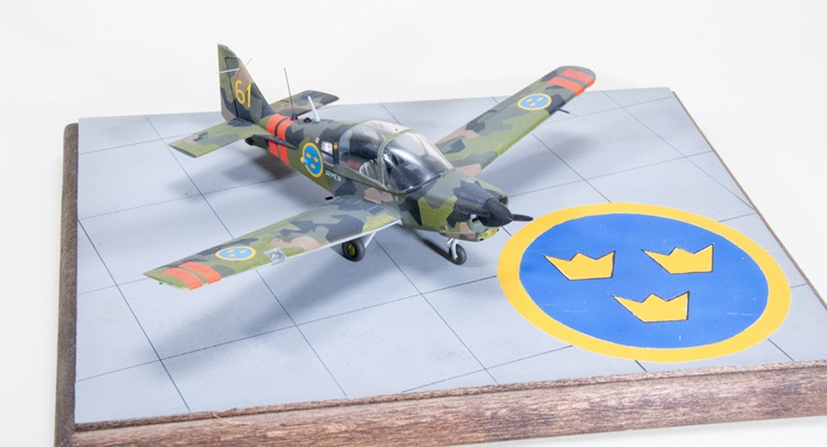 John placed seat belts, a fire extinguisher, and a canopy release mechanism to improve the verisimilitude of his Tarangus 1/48 scale SK 61 Bulldog. Decorated for the Swedish air force, the two-seat trainer wears splinter camouflage airbrushed with Real Colors lacquers using John’s hand-cut masks. He lightly weathered his prop plane with pastels and landed it on a craft-store base he adorned with Sweden’s three crowns.
