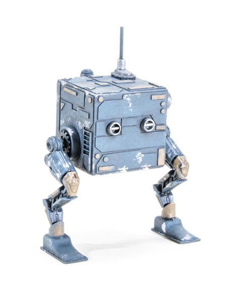 This cute robot’s body was scratchbuilt from styrene, and all the detail parts were salvaged from Tim’s spares box. Mostly Tamiya acrylics adorn the jaunty cube, including NATO Black as the base coat and Blue airbrushed from above to create shading. Tamiya Panel Line Accent Color picks out the panels, and Tim dry-brushed with lighter blues before chipping the paint with Tamiya Aluminum and a small sponge.