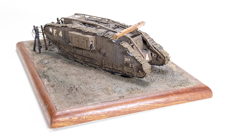 Merrill placed this Takom 1/35 scale Mark IV Female tank at Cambrai, France, 1917. Acrylic paints and an airbrush, plus pigments and washes, gave the tank a realistic appearance. He added posts and barbed wire along with groundwork to the wooden base.