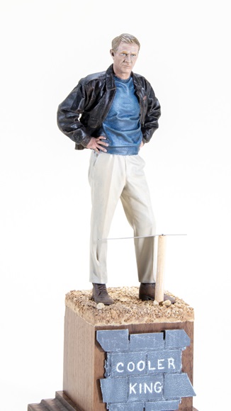 Modeling Steve McQueen as “The Cooler King” Hilts from the movie The Great Escape, Tim hand-painted a 1/16 scale figure from H3. He built up colors from LifeColor, Model Master, and PolyScale to achieve realistic lighting on the clothes and jacket. Putty and Woodland Scenics rocks made the groundwork, and Tim dusted the figure’s shoes with pigments to match. He made the 8th Air Force decal for the shoulder insignia Hilts and added scratches in the leather with burnt umber and yellow ochre.