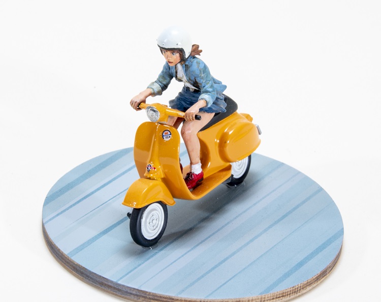 Howard combined a Tamiya 1/24 scale Vespa and a resin figure for his fun “Scooter Girl” model. He painted the Vespa Tamiya Orange from the spray can and finished the helmeted rider with Tamiya acrylics and artist-oil washes. He made the base by cutting a circle from a thin sheet of plywood and spray-painting a fun striped pattern that gives the model motion, almost like a frame from a comic book.