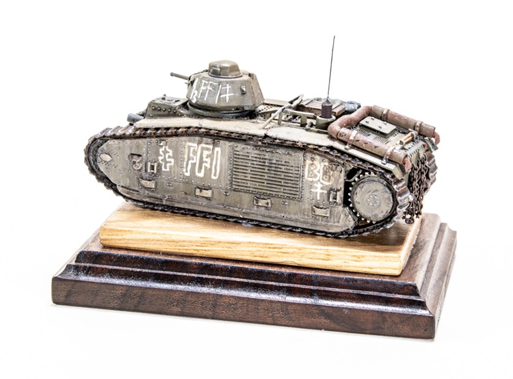 This 1/72 scale Char I Bis wears markings for the Free French Forces in 1944. Rob reworked the front vision slot, added cast texture to the Trumpeter kit’s turret and hull, and installed exhaust covers, rear chain hooks, and chains. AK Interactive acrylics furnished the tank’s colors, and he hand-painted the markings to reflect those on the real vehicle.