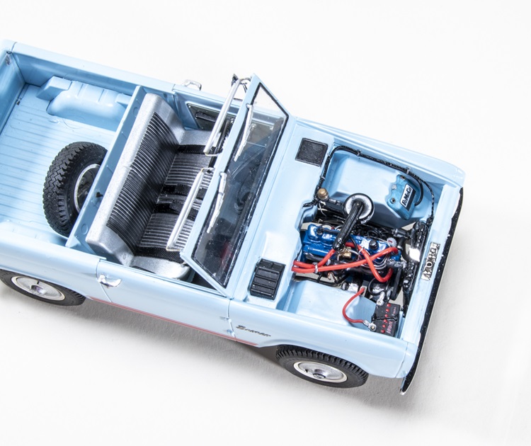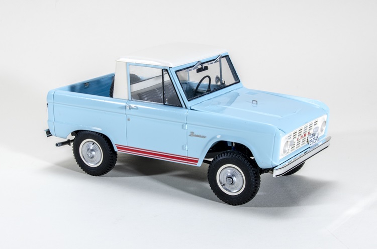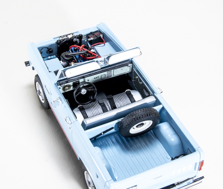 Michael got it into his head to replicate his grandpa’s 1966 Ford Bronco, and set about the task with a Revell 1/25 scale Bronco kit. Alterations included a resin six-cylinder engine that he plumbed and wired, a decked out interior, and a fully detailed underside. Michael airbrushed his replica MCW Arcadian Blue and Wimbledon White to match his granddad’s farm truck and protected it with a coat of Mr. Hobby Clear.