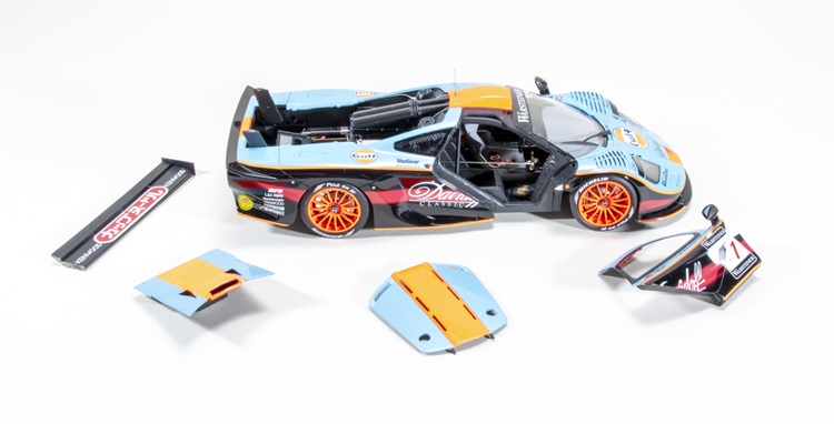Splash Paints decorate John’s Aoshima 1/24 scale McLaren F1 GTR longtail. He installed RB Motion wires and fittings along with a Hobby Design detail set to improve the model’s overall look. After the decals, John sealed the Gulf Team markings under a glossy 2K clear.