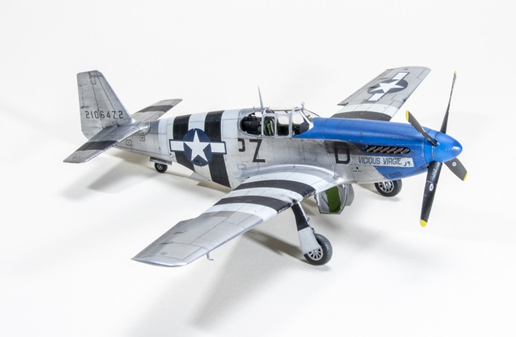 Matt built an Eduard 1/48 scale P-51B Mustang box stock and decorated it in D-Day markings for “Flying Scot II/Vicious Virgie” flying out of Bodney, England, piloted by Lt. Carleton Fuhrman. He primed the plane with Mr. Finish 1500, pre-shaded panel lines, and painted the natural-metal finish first. Next came the blue nose, and Matt left the invasion stripes for last. Pastels colored the nose and wings for exhaust and powder stains.