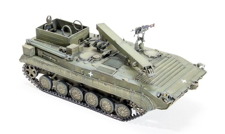 Black primer gave Model Master Dark Green a consistent base for Jacques’ work on his 1/35 scale Ukrainian BREM-2 (early) recovery vehicle. He worked up to lighter colors, creating depth, and dry-brushed to capture the brightest highlights. Starting with a Trumpeter BMP-1, he transformed the base kit into a BREM-2 with a SP Designs conversion set and SAAM Models 3D-printed detail parts for the antiaircraft machine-gun mount. Jacques kept the weathering light, with just washes and pinwashes.