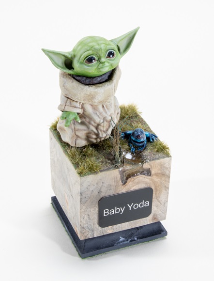 Baby Yoda (also known as Grogu) contemplates eating a frog in this hand-painted rendition of the lovable Force-wielder from the Disney+ streaming show, The Mandalorian. Robert completed the NY3DCreations 3D-printed figure with Scale 75 acrylic paints, attached it to a wooden base, and placed hobby grass. Cool how the resin water fills the space in the wooden base!