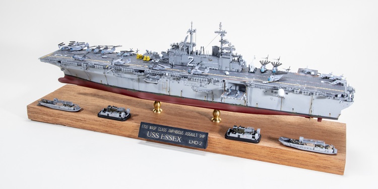 This model of the Wasp-class amphibious assault ship USS Essex came from a HobbyBoss 1/700 scale kit improved with an Eduard photo-etched metal detail set. Patrick airbrushed the base colors on the ship, laying down Tamiya acrylics with a Harder & Steenbeck. The subtle craft of applying washes and artist oils followed for rust and other discoloration caused by this ship’s time at sea.