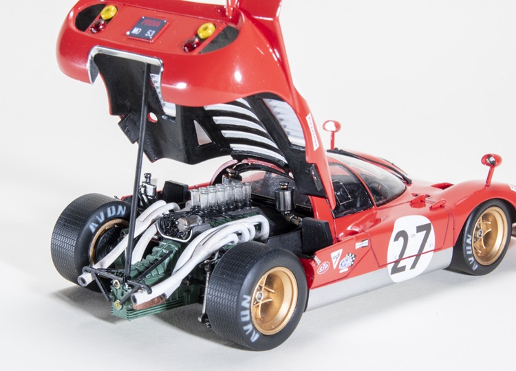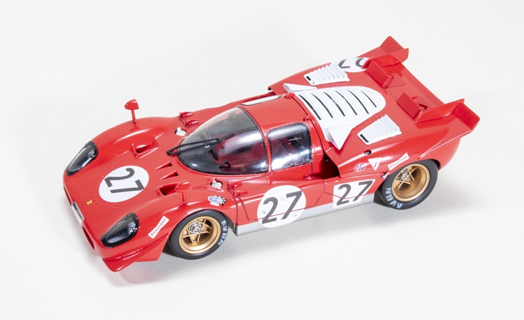 Ferraris look fast even when sitting still, and Steve’s Fujimi 1/24 scale 512S is no exception. He upgraded plenty on the car, including a ton of 3D-printed parts, louvers, wheels, velocity stacks, oil reservoir, coolant tanks, hinges, lights, tire stencils, and distributor. Whew! He cloaked the race car in Splash Paints Rosso Scuderia and Whitest White, marked it with STS decals, and gloss-coated with Mr. Color Super Clear.