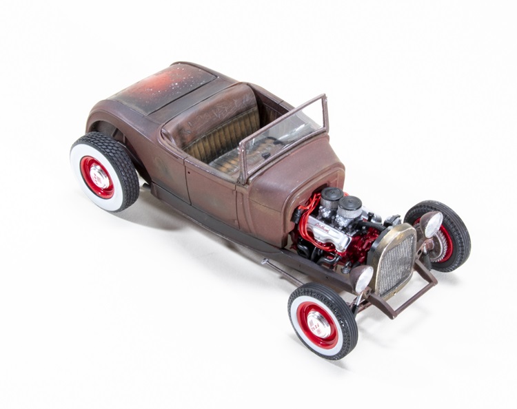 This Revell 1/25 scale 1929 Ford roadster depicts a barn find someone discovered, updated, and now drives for fun, according to Dean. He stuffed a 409 Weekend Wrencher from VGG Resins behind the radiator, a four-speed transmission behind it, and a banjo rear end. He weathered the heck out of the roadster with just about everything, including Rustall, pastels, and pigments over Testors enamels and Tamiya acrylics.
