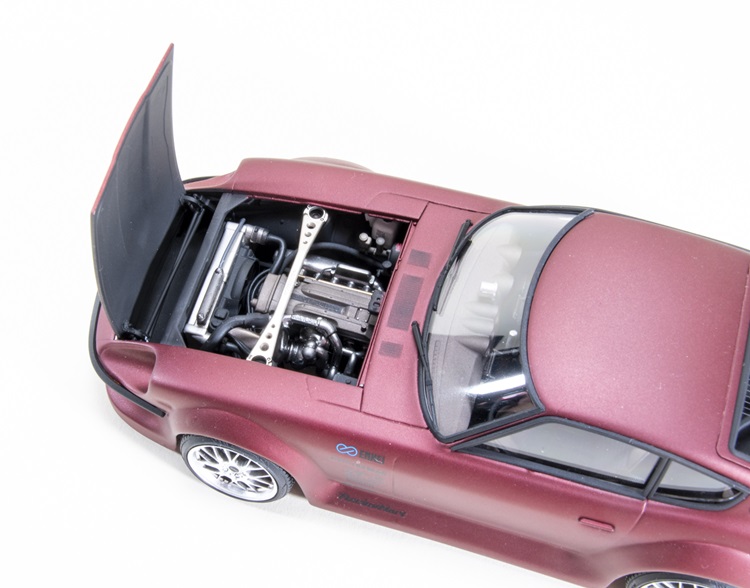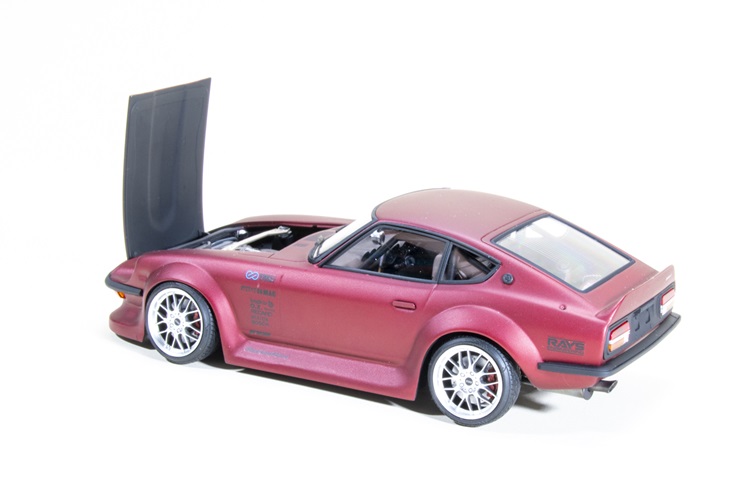 This dream JDM build started with a Tamiya 1/24 scale Nissan Fairlady Z. Brady swapped in a GTR engine and reworked the body with Milliput for a wide-body appearance. The car sports a 3D-printed interior, engine bay, and scratchbuilt roll cage. For a special matte finish, he airbrushed Dodge High Octane Red over Tamiya primer at a low pressure. A thin coat of flat clear went down over it, and then Brady misted on the red again to bring back a hint of the metallic twinkle.