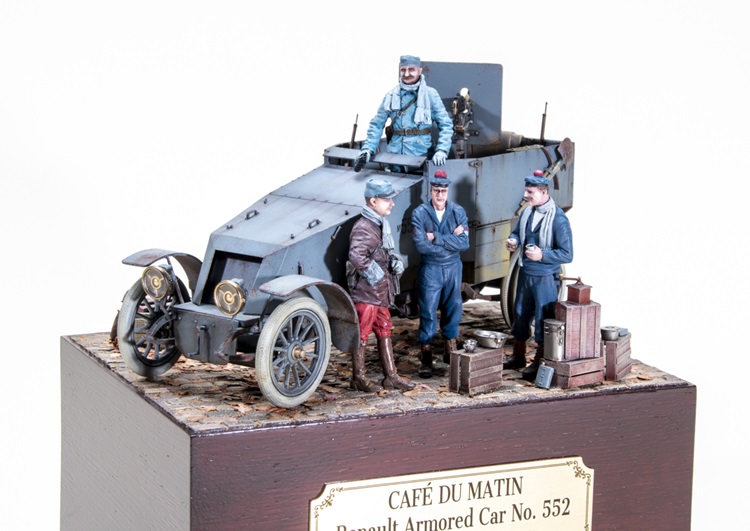 A little downtime finds a group of French soldiers enjoying coffee near a Renault armored car. Augie built a Copper State Models 1/35 scale kit and then worked it with Tamiya and Vallejo acrylics. Post-shading, washes, and pigments provided contrast and weathering effects. Copper State figures and accessories from ICM and MiniArt round out the World War I scene. For the base, Augie wrapped an XPS foam block in basswood sheet, stained it, and clear-coated with acrylic varnish.