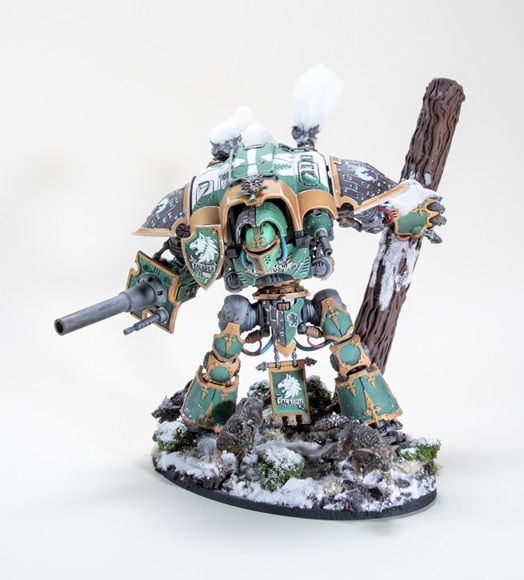 Kelsey built a Warhammer 40,000 Imperial Knight Paladin from a Games Workshop 28mm Knight Preceptor/Canis Rex kit. The concept was to show the massive war machine running to close in on its opponent. Games Workshop Fenrisian Wolves were added to the scene to help convey the sense of motion, and the tree, made from a cardboard tube with hot glue for the bark, has been knocked aside. With the exception of a few decals, Kelsey hand-painted the Paladin with Monument Hobbies and The Army Painter Warpaints acrylic colors and turned to Citadel Nuln Oil for shading. The base wears The Army Painter Battlefield Basing Snow, Vallejo Terrain Paste, and Citadel Stirland Battle Mire.