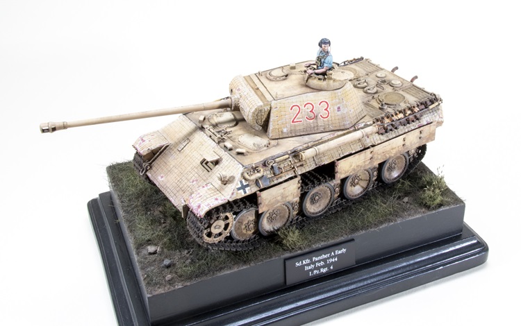 The groundwork on the base for Scott’s Dragon 1/35 scale Panther A places it in Italy, 1944. He dressed the kit up with aftermarket Zimmerit, metal tracks, and a turned-metal barrel. Tamiya paint, enamel weathering, and artist-oil dust effects topped by a sharp-eyed commander finish a tank from the 1st Panzer Division.