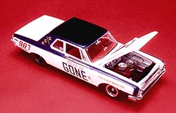 Considering the absence of engine wiring and linkages, the awesome Mopar "Max Wedge" V8 is accurately portrayed. Wiring is molded on the inner fender wells and fire wall. The ducted hood can be posed opened or closed. An excellent detail shot of the engine compartment is reproduced on the box side panel; all the photos on the box are of the full-size car.