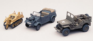 This kit's official name is "WWII Ground Vehicle Set," but it just as easily could have been "Diorama Helper." Academy provides a 1/72 scale Kubelwagen, Kettenkrad, and Jeep, all with detailed engine compartments. In addition to the vehicles, six crates, 15 jerry cans, and five 55-gallon drums are included.