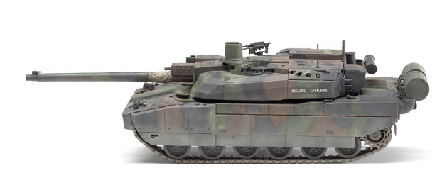 The Leclerc in French service is painted in a three-color, hard-edged camouflage scheme similar to the NATO scheme applied to U.S. and German tanks. The instructions suggest the NATO colors, but my references show a lighter green, so I used medium green (FS 34102) for the base color, with the NATO black and brown over that. Both the hull and turret have the anti-slip coating molded into the topsides, but after painting, the texture seems a bit too fine for the scale.