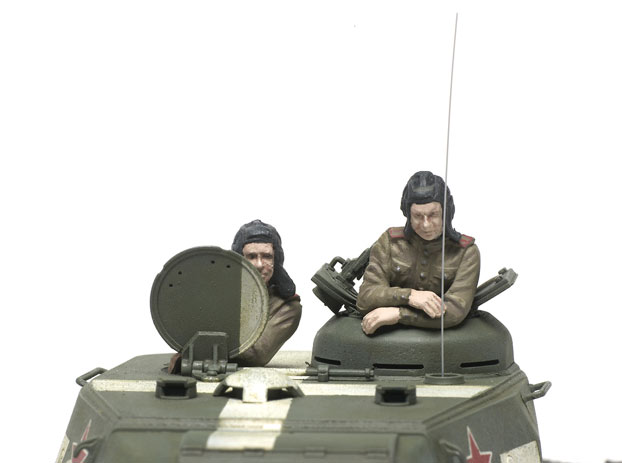 I airbrushed the turret white, masked off the air-recognition markings, and painted the hull, turret, and wheels Model Master Acryl Russian armor green, highlighting panels with a lighter shade. Decals went down well over the semigloss surface with help from Micro Sol.