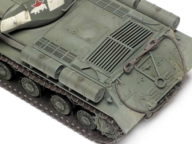 The model builds beautifully. Every-thing fits perfectly; I had only to scrape a couple of minor mold seams on the suspension arms. A drop of super glue filled a tiny gap between the glacis plate and lower hull. In Step 9, you need to open several location holes, including options for the horn and headlight; choose the one appropriate for the Stalin you're modeling. I love the effect of the engine louvers (parts C57 and C58) under the photoetched-metal grilles. Sponson blanking plates are included. I attached the tools, tow cables, and auxiliary fuel tanks before painting.