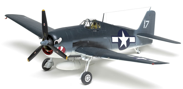 The gun barrels are fragile and incorrectly molded. Hellcat gun barrels were fitted inside smooth, close-fitting blast tubes without cooling vents. The outboard guns should not protrude from the end of the flush-mounted blast tubes. Parts for a retracted or deployed tail hook are provided.