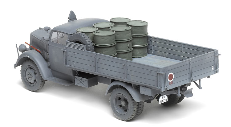 Tamiya's truck is a low-bed, six-bolt-wheel rendition featuring a detailed cab, suspension, and fuel-drum set. Positionable front wheels, separate cab doors, and hood pieces are included, as well as painting masks for the windows. A four-color decal sheet provides markings for four vehicles.