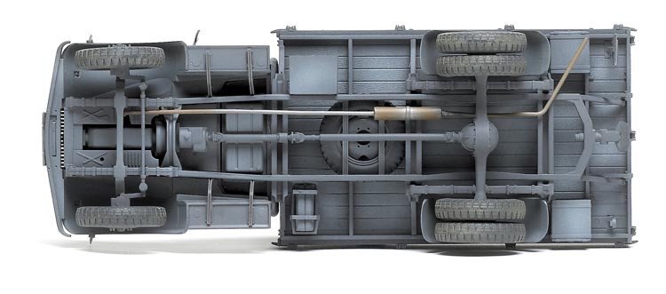 The cargo bed showed light ejector-pin marks that are difficult to erase because of the molded wood grain. Archer Transfers offers wood-grain decals that can be cut and applied before painting to fix this problem. The bed went together without problems. I loaded it with kit-supplied fuel drums painted Tamiya XF-65 field gray.