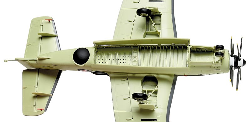 I found very few photos of Gannet control surfaces not being faired, and none with the Fairey-Youngman flaps extended on the ground, so I posed the flaps up and offset just the rudder and elevator to make the model more dynamic. No stores are given for the weapons bay, but its interior detail is super.