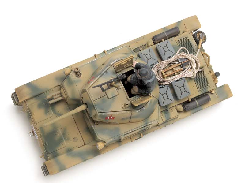 Attaching parts to the upper hull was a breeze, with no fit problems or gaps, and the fighting compartment fits nicely. Next came stowage boxes and tools. Directions are unclear on the placement of the stowage boxes and exhaust cans; test-fit to ensure you have them right. I added the exhaust cans and tools after painting. Turret installation was trouble-free. I was disappointed with the solid-molded headlight; a clear lens would have really stood out.