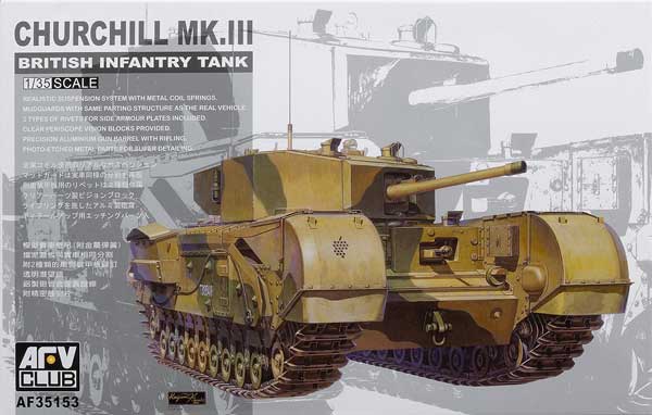 When I first saw the artwork for AFV Club's Churchill Mk.III at the 2008 AMPS show, its detailed suspension, metal barrel, and overall detail got my attention - and the kit has lived up to its advances with a movable suspension, positionable hatches, metal barrel, clear optical pieces, and markings for three British and one Russian vehicle.