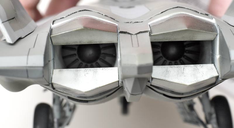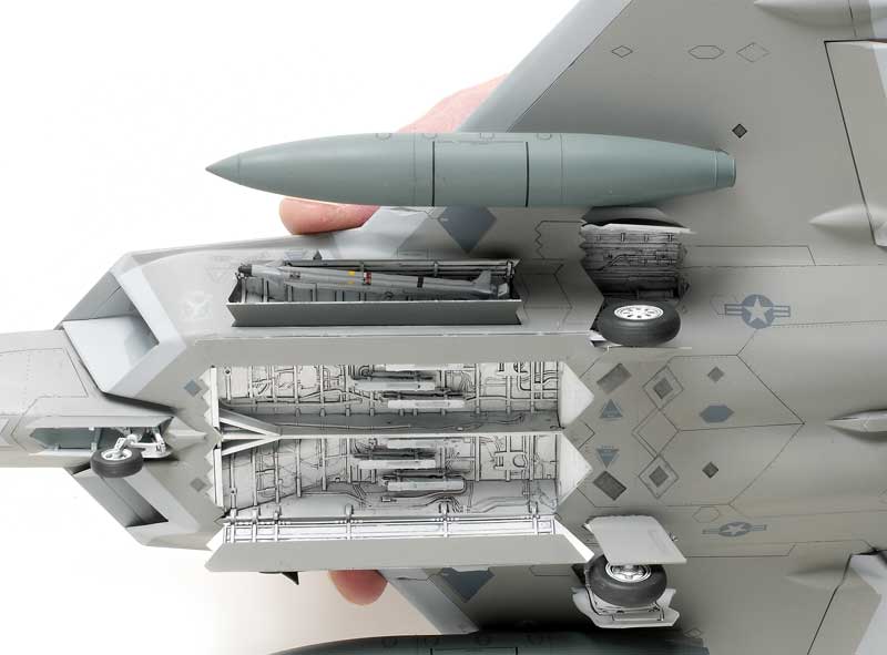 Abundant detail includes full ducting for the air intakes, exhaust section, and the option of exhaust petals. Flaps can be displayed lowered, the arrestor hook can be be posed deployed, and all three weapons bays can be left open or closed. A bounteous assortment of ordnance includes AIM-9M and AIM-9X Sidewinders, AIM-120 AMRAAMs, and GBU-32 bombs. You can also attach underwing fuel tanks. The main wheel wells are nicely detailed, but there is no detail in the nose wheel well.