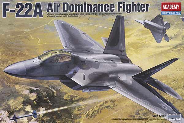 Academy's impressive 1/48 scale F-22A comes in a big box comprising 259 gray-green, individually bagged sprues of injection-molded parts featuring finely engraved panel lines and complex surface detail. Instead of the usual left/right fuselage halves, Academy molded the fuselage and wings together in top and bottom halves, eliminating wing-to-fuselage seams and any wing alignment issues.