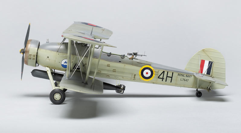 Trumpeter has included a good amount of detail with an optional clear fuselage to show it off. The kit also provides vinyl wheels and a sheet of photoetched-metal parts including rigging. If you like, separate struts allow the wings to be assembled folded. The only weapons load is a torpedo; it looks the part, and the rack fits very well. I was happy to see the elegantly simple torpedo sight correctly portrayed as two bars with rings representing the lights used in the real sight. Decals for two fairly plain color schemes are included.
