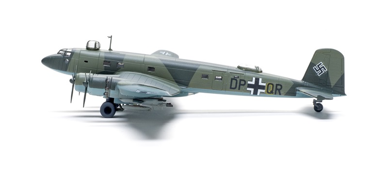 I painted my Fw 200 Tamiya J.A. green (XF-13), light blue (XF-23), and dark green/JGSDF (XF-73). Odd choices, but they looked close enough to the standard Luftwaffe maritime camouflage in this scale. The decals went on without trouble, but the yellow in the fuselage code Q is a bit out of register.