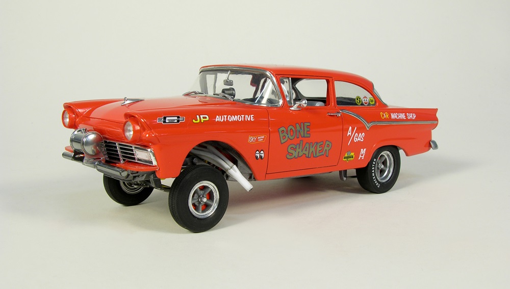 Andy Behrens added aftermarket decals to an otherwise box-stock Revell 1/25 scale ‘57 Ford gasser. It looks good under its Automotive Touchup Calypso Coral (1970 Mustang) finish.