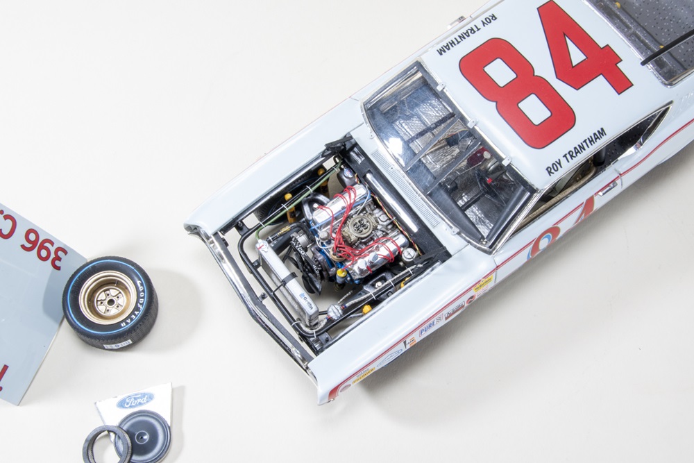 Taking a Polar Lights 1/25 scale Mercury Cyclone, David Hawkins modeled the 1968 Ford Torino driven by Roy Trantham. He dropped the car’s nose and replaced the kit wheels, tires, and decals with others from Plastic Performance Products.